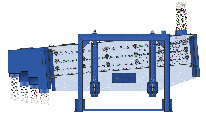 方形搖擺篩啟動(dòng)后,篩機(jī)搖動(dòng)體即篩箱在慣性力的作用下做前后往復(fù)運(yùn)動(dòng),篩箱帶動(dòng)篩面做周期性搖動(dòng),從而使篩面上的物料隨篩箱一同做定向跳躍式運(yùn)動(dòng),期間,小于篩面孔徑的物料通過篩孔落到下層,成為篩下物,大于篩面孔徑的物料經(jīng)連續(xù)翻滾跳躍運(yùn)動(dòng)后從排料款排出,完成篩分工作。